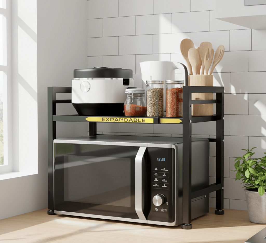 This stand gives you instant counter space. It fits the microwave on top and offers extra storage space underneath. Adjustable width means it works in almost any kitchen.