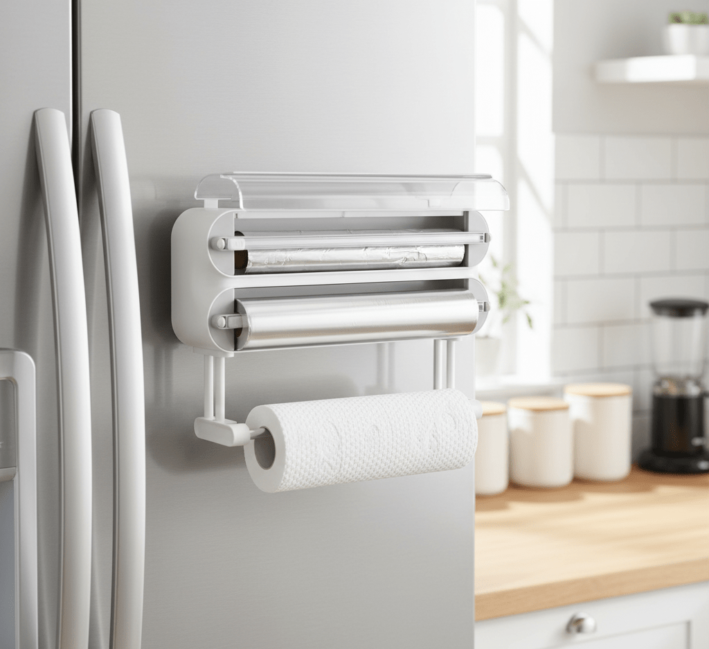 If you love a tidy kitchen, this one is for you. It neatly holds foil, cling wrap, and paper towels in one place. The built-in cutters give smooth, clean cuts every time (no more fighting with cling wrap!).