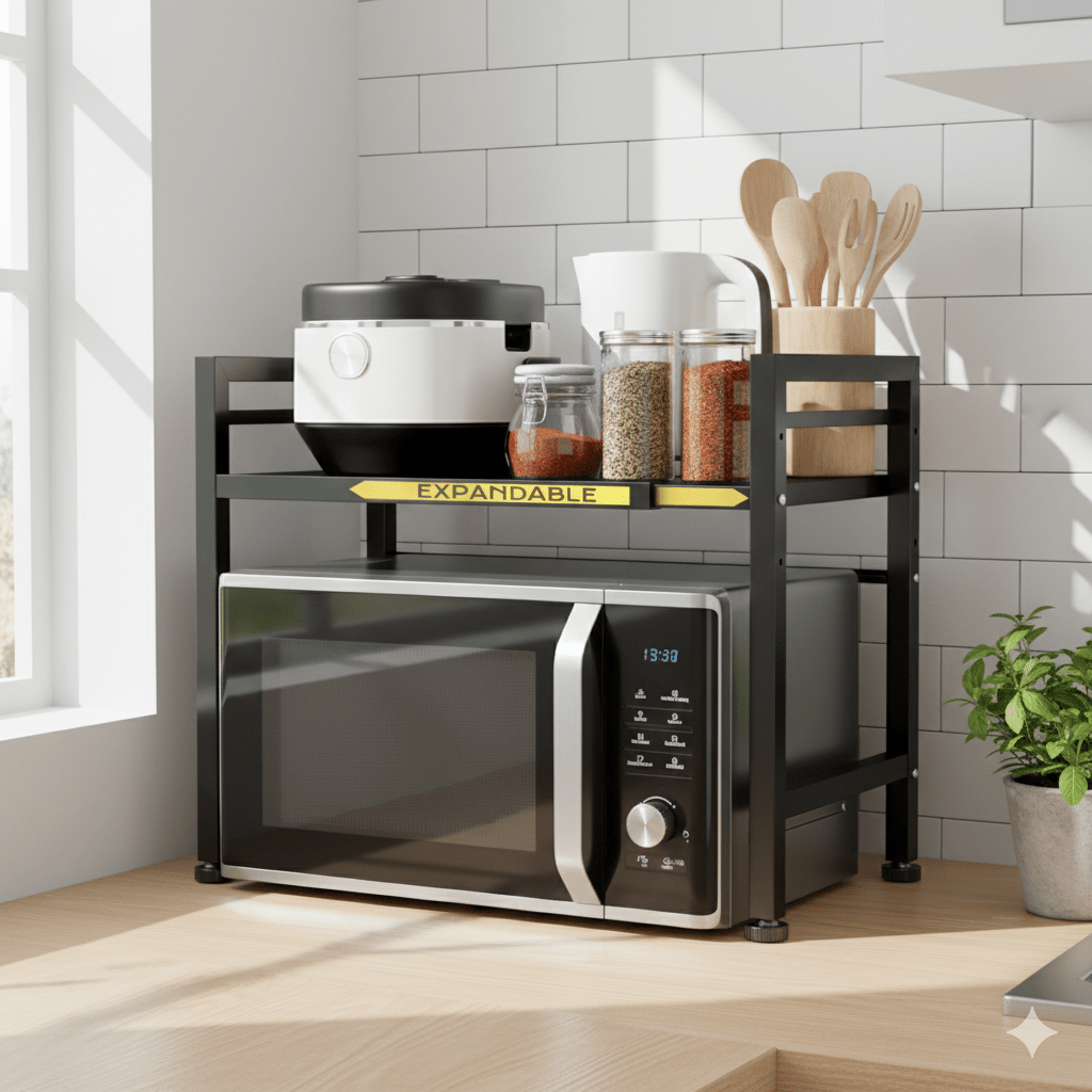 This adjustable microwave stand adds extra storage for jars, mugs, plates, or appliances, making it perfect for small kitchens. Sturdy, space-saving, and super functional โ a must-have if you want a cleaner, more organized countertop