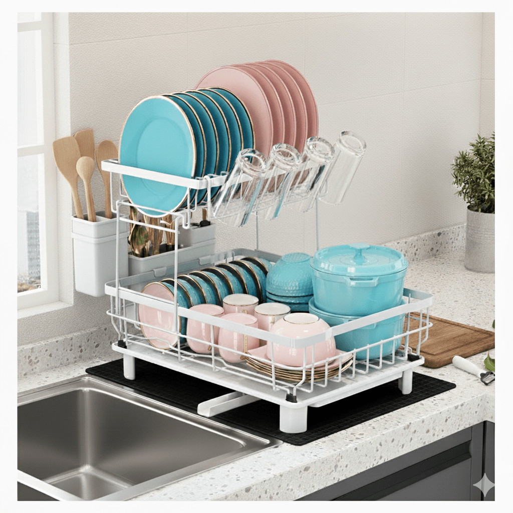 This 2-tier rack keeps plates, glasses, utensils, and pans neatly organized. The swivel-drain spout ensures zero water pooling. Itโs one of my favourite purchases for a tidy, efficient kitchen.