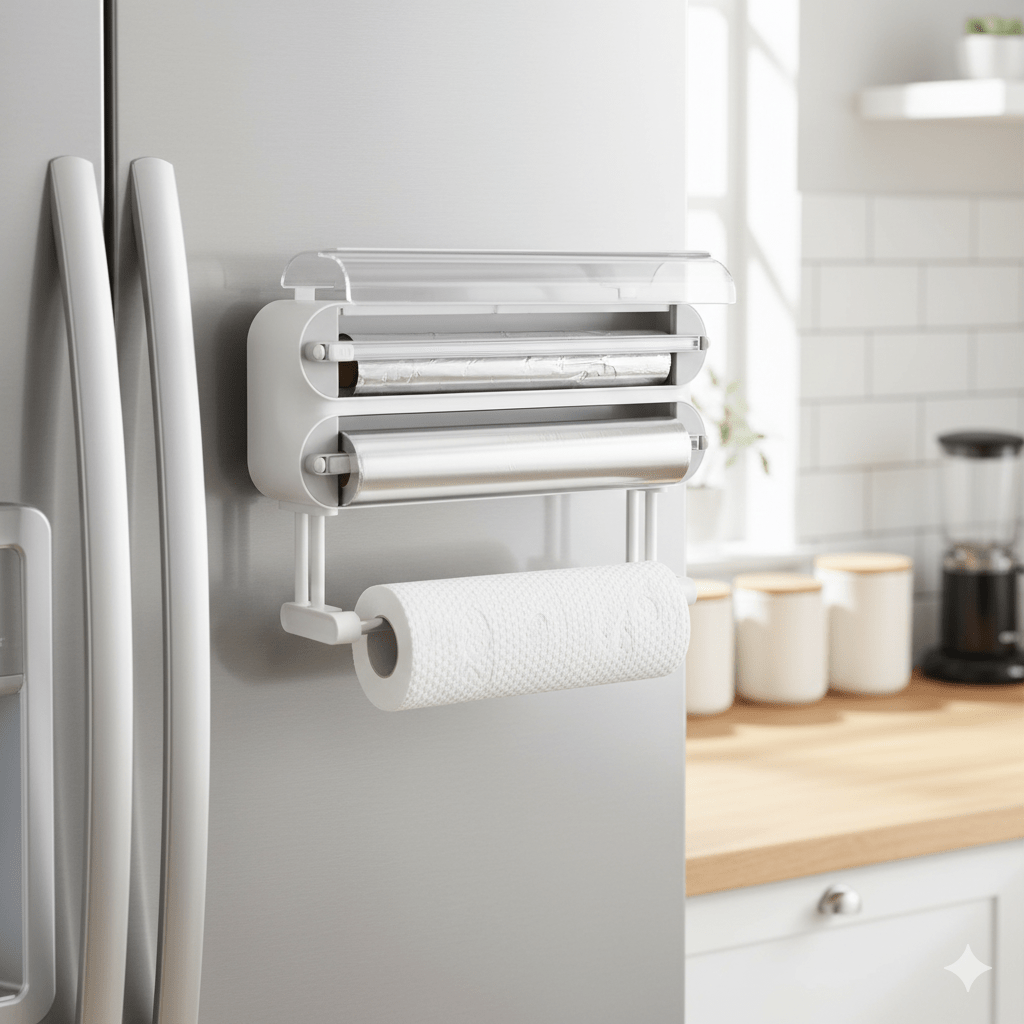 This 3-slot organizer neatly stores foil, cling wrap, baking paper, and even comes with smooth cutters. A tiny upgrade that saves you timeย every single day.